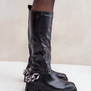 Kozaki damskie wykonane z eko skóry to idealne połączenie wygody i stylu. Płaski obcas zapewnia komfort noszenia przez cały dzień. Zaokrąglone noski. Cholewka sięgająca przed kolano jest ozdobiona modnym łańcuchem. Stylowe i uniwersalne, świetnie sprawdzą się w codziennych i bardziej wyjściowych stylizacjach.