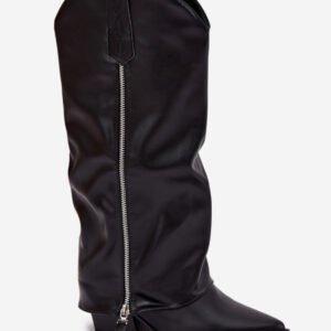 Kozaki kowbojki wykonane z eko skóry to stylowa propozycja na chłodniejsze dni. Ocieplany model zapewnia komfort i ciepło, a ścięty obcas typu słupek dodaje sylwetce lekkości i charakteru. Szpiczaste noski podkreślają kobiecy styl, a efekt wywiniętej cholewki nachodzącej na obcas nadaje oryginalnego, modnego wyglądu. Kozaki są wsuwane, z zamkiem umieszczonym na dole, co ułatwia zakładanie. To doskonały wybór dla kobiet, które lubią łączyć wygodę z trendami.