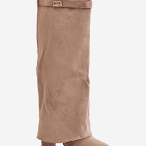 Eleganckie damskie kozaki z ekologicznego zamszu. Osadzone na obcasie w formie słupka. Noski w szpic. Wnętrze zostało ocieplone kocem obuwniczym. Wyjątkowym elementem tego modelu jest wywinięta cholewka z odpinanym paskiem na górze cholewki, która zachodzi na obcas. Zapięcie na suwak. Doskonałe do noszenia z sukienkami lub spódnicami!