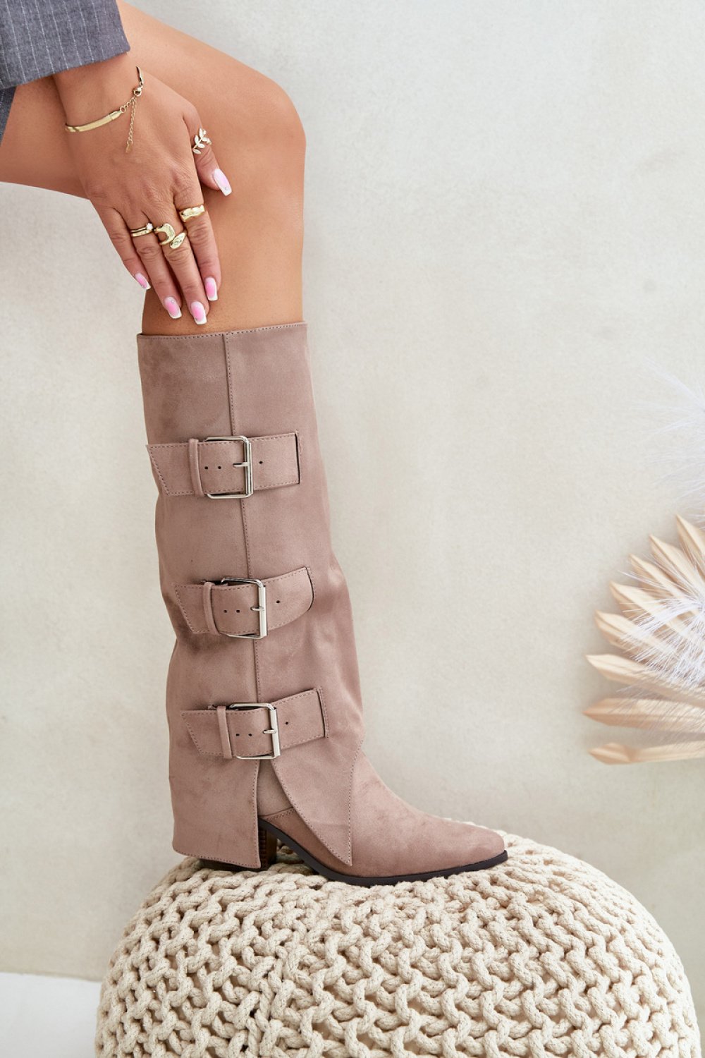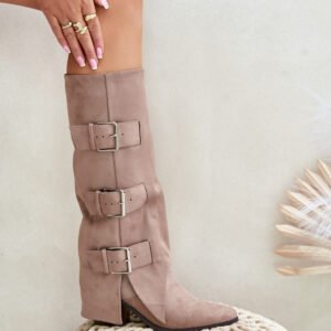 Stylowe kozaki damskie wykonane z eko zamszu. Osadzone na obcasie w formie słupka. Noski w szpic. Środek ocieplony kocem obuwniczym. Głównym atutem tego modelu jest wywinięta cholewka ozdobiona złotymi klamrami. Model wsuwany z dodatkowym suwakiem na dole. Idealnie sprawdzą się w stylizacjach z luźnymi marynarkami, spódnicami i sukienkami! Koniecznie powinnaś je mieć!