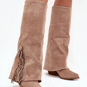 Wsuwane kozaki kowbojki z eko zamszu, osadzone na obcasie słupku, to połączenie wygody i stylu. Szpiczaste noski dodają elegancji, a cholewka ozdobiona frędzlami wprowadza lekki, boho akcent. Idealne do casualowych stylizacji, świetnie komponują się z sukienkami, spódnicami i spodniami, nadając każdej kreacji odrobinę kowbojskiego uroku.