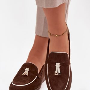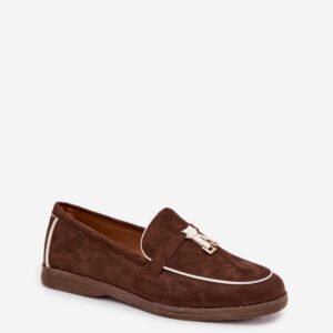 Stylowe damskie loafersy wykonane z eko zamszu. Model na płaskim obcasie gwarantuje wygodę przez cały dzień, a subtelny, ozdobny detal z przodu nadaje im modnego akcentu. Zaokrąglone noski podkreślają klasyczny krój, dzięki czemu buty doskonale pasują zarówno do casualowych, jak i bardziej eleganckich stylizacji.
