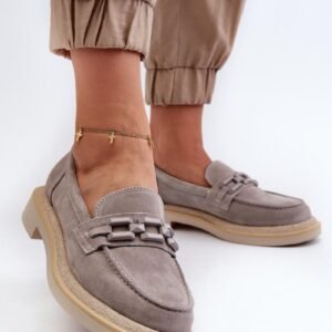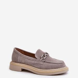 Mokasyny damskie wykonane z naturalnego zamszu. Płaski obcas gwarantuje stabilność i wygodę podczas chodzenia. Dodatkowy element ozdobny z przodu dodaje im oryginalności, co sprawia, że są one nie tylko praktyczne, ale także modne. Te mokasyny będą idealnym dopełnieniem wielu różnych stylizacji, zarówno casualowych, jak i bardziej eleganckich.