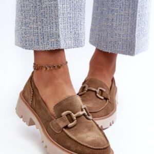 Mokasyny damskie wykonane z naturalnego zamszu. Osadzone na płaskim obcasie. Dodatkowy element ozdobny z przodu nadaje im wyjątkowego uroku, co sprawia, że stają się one oryginalnym dodatkiem do każdej stylizacji. Bez względu na to, czy wybierasz się na spotkanie ze znajomymi, czy na bardziej formalne wydarzenie, te mokasyny będą idealnym dopełnieniem Twojego looku, dodając mu nuty subtelnej elegancji.