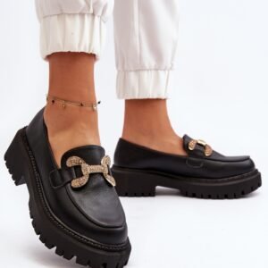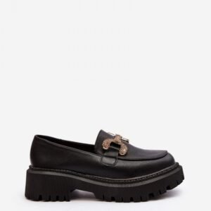 Mokasyny damskie wykonane z eko skóry. Osadzone na masywnym, płaskim obcasie oraz grubej podeszwie. Model ten posiada zaokrąglone noski oraz złotą ozdobę z przodu. Koniecznie powinnaś je mieć w swojej szafie!