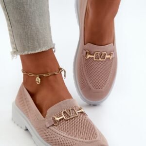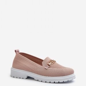 Damskie mokasyny wykonane z przewiewnej tkaniny. Osadzone na płaskim obcasie, co zapewnia komfort noszenia przez cały dzień. Zaokrąglone noski nadają im klasyczny wygląd. Ozdobione złotym detalem. Miękka wkładka z pianki, dodatkowo pokryta materiałem, gwarantuje wygodę.