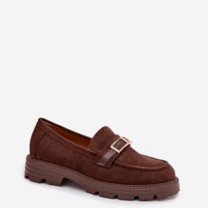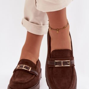 Eleganckie mokasyny damskie z eko zamszu to połączenie klasyki i wygody. Przód buta zdobi subtelny paseczek ze złotą klamrą, który nadaje całości stylowego akcentu. Miękka wkładka wykonana z eko skóry zapewnia komfort noszenia przez cały dzień. Ten model doskonale sprawdzi się zarówno w codziennych, jak i bardziej eleganckich stylizacjach.