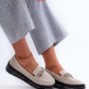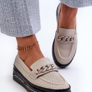 Mokasyny damskie wykonane ze skóry naturalnej. Z przodu pasek z łańcuchem. Osadzone na platformie, zapewniają dodatkową amortyzację i stabilność podczas chodzenia. Skórzana wkładka comfort. Te modne mokasyny doskonale uzupełnią różnorodne stylizacje!
