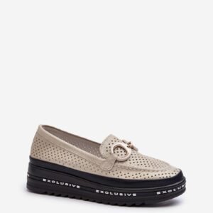 Ażurowe mokasyny damskie marki S.Barski. Wykonane ze skóry naturalnej. Osadzone na platformie. Noski zaokrąglone. Z przodu ozdoba. Miękka wkładka zapewni wygodę podczas użytkowania. Te mokasyny doskonale sprawdzą się jako stylowy dodatek do wielu różnych stylizacji!
