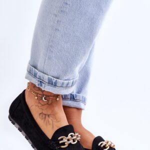 Mokasyny damskie zostały wykonane z eko zamszu. Posiadają na przodzie ozdobny łańcuszek z dżetami. Mokasyny zostały osadzone na platformie z gumową, antypoślizgową podeszwą. Miękka wkładka z eko skóry zapewni komfortowe użytkowanie. Koniecznie powinnaś je mieć!