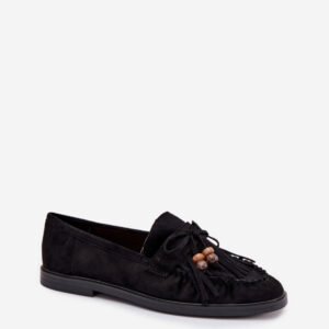 Mokasyny damskie z eko zamszu to stylowa propozycja na co dzień. Przód buta zdobią dekoracyjne frędzle oraz wiązanie w formie kokardki z koralikami, które dodają całości subtelnego, kobiecego charakteru. Miękki materiał zapewnia komfort noszenia, a klasyczny fason sprawia, że mokasyny doskonale uzupełnią zarówno casualowe, jak i bardziej eleganckie stylizacje.