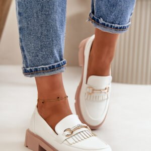 Damskie, klasyczne mokasyny zostały wykonane z eko skóry. Osadzone na płaskim obcasie. Na przodzie posiadają złotą ozdobę. Noski zaokrąglone. Mokasyny posiadają wkładkę z miękkiej eko skóry. Świetny model na sezon wiosenno-jesienny! Koniecznie powinnaś je mieć!