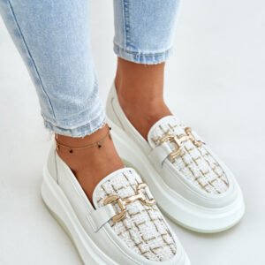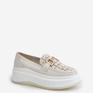 Eleganckie damskie mokasyny wykonane z naturalnej skóry to idealny wybór dla kobiet ceniących klasyczny styl z nowoczesnym akcentem. Osadzone na platformie. Z przodu buta znajduje się złota ozdoba, która dodaje im unikalnego charakteru. Zaokrąglone noski. Idealne zarówno do codziennych, jak i bardziej formalnych stylizacji.