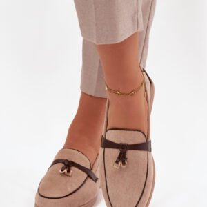 Stylowe damskie loafersy wykonane z eko zamszu. Model na płaskim obcasie gwarantuje wygodę przez cały dzień, a subtelny, ozdobny detal z przodu nadaje im modnego akcentu. Zaokrąglone noski podkreślają klasyczny krój, dzięki czemu buty doskonale pasują zarówno do casualowych, jak i bardziej eleganckich stylizacji.