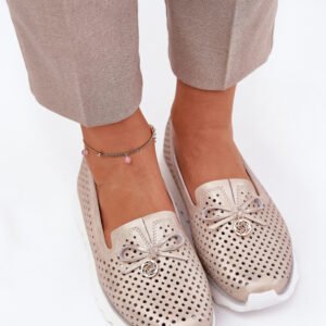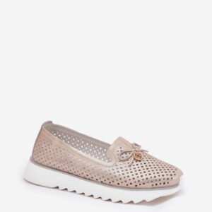 Eleganckie półbuty damskie wykonane z naturalnej skóry. Osadzone na platformie, która ozdobiona została brokatem. Model z ażurową cholewką. Zaokrąglone noski zapewniają wygodę, a z przodu butów znajduje się kokardka oraz subtelny detal, dodający im uroku. Skórzana, miękka wkładka gwarantuje komfort przez cały dzień. Te półbuty będą idealnym wyborem na co dzień, łącząc elegancję z funkcjonalnością i pasując do wielu stylizacji.