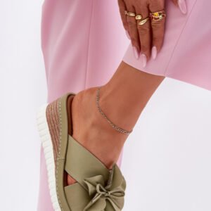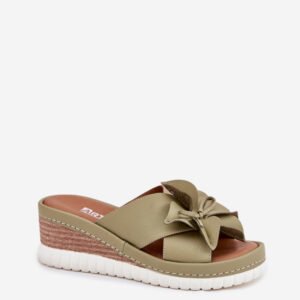 Damskie klapki wykonane z wysokiej jakości naturalnej skóry. Osadzone na koturnie. Z przodu buta znajduje się subtelny ozdobny kwiatek, który dodaje wyjątkowego charakteru. Bardzo miękka wkładka zapewnia komfort przez cały dzień, sprawiając, że te klapki będą idealnym wyborem do letnich stylizacji, łącząc funkcjonalność z modnym wyglądem.