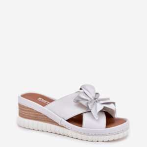 Damskie klapki wykonane z wysokiej jakości naturalnej skóry. Osadzone na koturnie. Z przodu buta znajduje się subtelny ozdobny kwiatek, który dodaje wyjątkowego charakteru. Bardzo miękka wkładka zapewnia komfort przez cały dzień, sprawiając, że te klapki będą idealnym wyborem do letnich stylizacji, łącząc funkcjonalność z modnym wyglądem.
