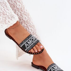 Klapki damskie na płaskim obcasie, z ozdobnym paskiem „Amore”. Eko skórzana wkładka zapewnia wygodę przez cały dzień, a stylowy wygląd sprawia, że są doskonałym wyborem zarówno na co dzień, jak i na wieczorne wyjścia. Idealne do letnich sukienek, spódnic czy spodni.