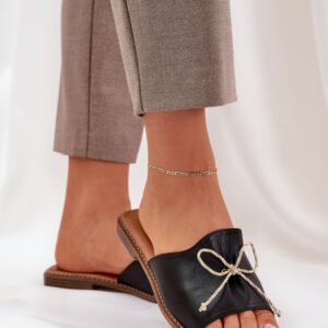 Eleganckie klapki damskie z eko skóry to doskonały wybór dla kobiet, które cenią styl i komfort. Osadzone na płaskim obcasie, zapewniają wygodę przez cały dzień. Z przodu butów znajduje się subtelna kokardka, która dodaje im delikatnego, kobiecego uroku. Miękka wkładka gwarantuje komfort noszenia, a prosta, ale elegancka forma sprawia, że te klapki będą świetnym dopełnieniem wielu stylizacji. Idealne na letnie dni, kiedy chcesz wyglądać modnie i czuć się wygodnie.