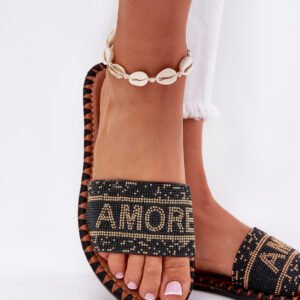 Damskie klapki na płaskim obcasie to doskonały wybór na upalne dni! Model ten posiada zdobiony pasek oraz efektowny napis Amore, który nadaje im wyjątkowego charakteru. Świetnie komponują się z różnymi stylizacjami, stanowiąc uniwersalny element garderoby. Koniecznie musisz je mieć!
