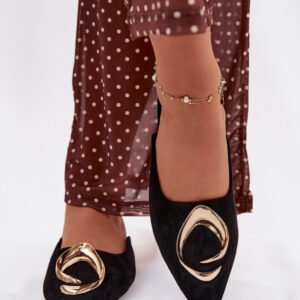 Klapki damskie typu mule wykonane z eko zamszu to stylowa propozycja o eleganckim charakterze. Zakryte, szpiczaste noski nadają modelowi klasycznej formy, a duży złoty detal z przodu stanowi efektowny akcent przyciągający uwagę. Płaski obcas zapewnia wygodę noszenia. Model idealnie uzupełni zarówno eleganckie, jak i casualowe zestawy.