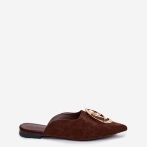 Klapki damskie typu mule wykonane z eko zamszu to stylowa propozycja o eleganckim charakterze. Zakryte, szpiczaste noski nadają modelowi klasycznej formy, a duży złoty detal z przodu stanowi efektowny akcent przyciągający uwagę. Płaski obcas zapewnia wygodę noszenia. Model idealnie uzupełni zarówno eleganckie, jak i casualowe zestawy.