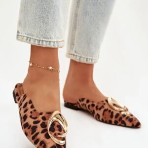 Klapki damskie typu mule wykonane z eko zamszu to stylowa propozycja o eleganckim charakterze. Zakryte, szpiczaste noski nadają modelowi klasycznej formy, a duży złoty detal z przodu stanowi efektowny akcent przyciągający uwagę. Płaski obcas zapewnia wygodę noszenia. Model idealnie uzupełni zarówno eleganckie, jak i casualowe zestawy.