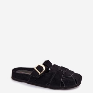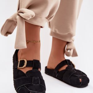 Klapki damskie z eko zamszu typu mule to połączenie wygody i modnego wyglądu. Paski ze złotą klamrą stanowią efektowny detal, który dodaje całości szyku i modnego charakteru. Profilowana wkładka zapewnia komfort noszenia oraz lepsze dopasowanie do stopy. Ten model doskonale sprawdzi się w codziennych stylizacjach.