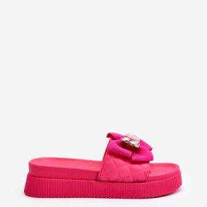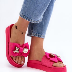 Damskie klapki wykonane z eko skóry. Osadzone na masywnej platformie. Model ten posiada materiałową kokardę i imitację agrafki z misiem i blaszką z napisem. Idealne klapki na nadchodzący sezon! Koniecznie powinnaś je mieć!