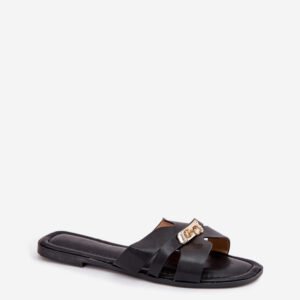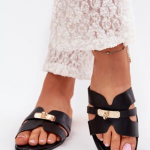 Klapki damskie z eko skóry, płaskie i wygodne, wyróżniają się subtelnym paseczkiem ozdobionym złotym detalem, który dodaje im elegancji. Miękka wkładka zapewnia komfort przez cały dzień. Idealne zarówno na co dzień, jak i na wieczorne wyjścia, doskonale komponują się z letnimi stylizacjami, łącząc prostotę z elegancją.