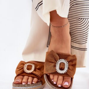 Klapki wykonane z eko zamszu. Z przodu kokardka i ozdobna broszka. Osadzone na platformie z brokatem, który wprowadza do każdej stylizacji odrobinę blasku i elegancji. Te klapki będą doskonałym wyborem na letnie dni, idealnie komponując się z sukienkami, spódnicami czy szortami, dodając każdemu lookowi nowoczesnego akcentu.