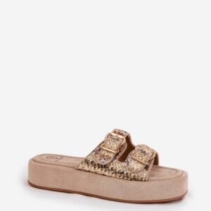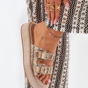 Stylowe klapki damskie na platformie, które łączą wygodę z modnym wyglądem. Ozdobione plecionką i klamrami, co dodaje unikalnego charakteru. Miękka, eko zamszowa wkładka zapewnia komfort przez cały dzień. Te klapki doskonale sprawdzą się w letnich stylizacjach, pasując do sukienek, spódnic czy szortów, wprowadzając lekkość do każdej okazji.