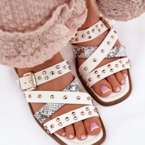 Klapki damskie wykonane z eko skóry. Osadzone na płaskim obcasie. Model wyróżnia się subtelnym zdobieniem, klamrą oraz paskami, które nadają im nowoczesnego charakteru. Doskonałe do codziennych stylizacji, łączą komfort z modnym wyglądem, idealne na letnie spacery czy casualowe wyjścia.