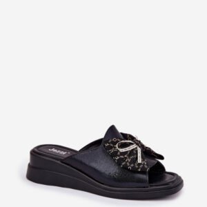 Klapki damskie od marki Jezzi, wykonane z eko skóry, to elegancka opcja na ciepłe dni. Osadzone na koturnie, zapewniają stabilność i komfort przez cały dzień. Model wyróżnia się kokardką z przodu, która dodaje im subtelnego uroku, idealnie komponując się z letnimi stylizacjami.