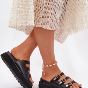 Klapki damskie z eko skóry, osadzone na platformie, to połączenie komfortu i stylu. Model wyróżnia się trzema cienkimi, regulowanymi paseczkami z klamrami, które pozwalają na idealne dopasowanie do stopy. Miękka wkładka zapewnia wygodę przez cały dzień, a nowoczesny design sprawia, że klapki doskonale komponują się z letnimi stylizacjami. Idealne na co dzień, łączą funkcjonalność z modnym wyglądem.