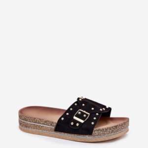 Stylowe klapki damskie z eko zamszu, ozdobione klamrą i ćwiekami, które nadają im nowoczesnego i odważnego charakteru. Osadzone na platformie z brokatem, które wprowadzają do każdej stylizacji subtelny blask. Doskonałe na letnie dni, te klapki łączą wygodę z modnym wyglądem, świetnie pasując do sukienek, spódnic i spodni.