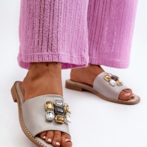 Damskie klapki na płaskim obcasie z ozdobami. Wykonane z wysokiej jakości materiałów. Miękka, skórzana wkładka zapewni komfort noszenia przez cały dzień. Elegancki design sprawia, że są idealnym wyborem na różne okazje.
