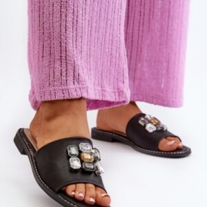 Damskie klapki na płaskim obcasie z ozdobami. Wykonane z wysokiej jakości materiałów. Miękka, skórzana wkładka zapewni komfort noszenia przez cały dzień. Elegancki design sprawia, że są idealnym wyborem na różne okazje.
