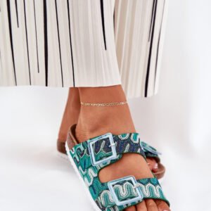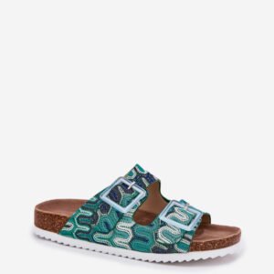 Wzorzyste klapki damskie z materiału tekstylnego, osadzone na korkowej platformie, które łączą wygodę z modnym wyglądem. Dwa paski z klamrami ozdobione brokatem dodają im wyjątkowego charakteru. Profilowana zamszowa wkładka zapewnia komfort przez cały dzień. Te klapki będą doskonałym wyborem na letnie dni, idealnie komponując się z sukienkami, spódnicami czy szortami, wprowadzając do każdej stylizacji lekkość i blask.