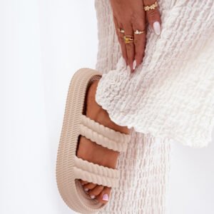 Klapki damskie wykonane z lekkiego piankowego materiału, osadzone na platformie, które oferują wygodę przez cały dzień. Dwa paski z przodu zapewniają stabilność i pewność podczas chodzenia. Idealne na gorące dni, te klapki to doskonały wybór na wakacje, czas przy basenie lub na plaży, łącząc funkcjonalność z komfortem.