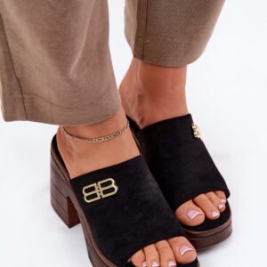 Eleganckie klapki damskie wykonane z eko zamszu to idealny wybór na wyjątkowe okazje. Złoty detal z przodu dodaje im subtelnego blasku, nadając im elegancki charakter. Osadzone na masywnym obcasie i platformie, zapewniają stabilność oraz komfort przez cały dzień. Te klapki łączą nowoczesny wygląd z funkcjonalnością, doskonale komponując się z eleganckimi stylizacjami na różne uroczystości i wieczorne wyjścia.