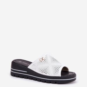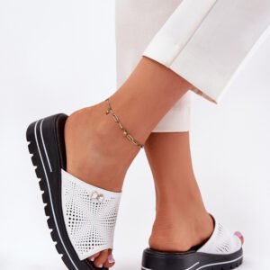 Damskie klapki wykonane z naturalnej skóry to elegancka i komfortowa opcja na ciepłe dni. Osadzone na koturnie, zapewniają stabilność i wygodę przez cały dzień. Z boku, na pasku, znajduje się subtelny ozdobny detal, który dodaje im wyjątkowego charakteru. Skórzana wkładka gwarantuje komfort noszenia, czyniąc te klapki doskonałym wyborem do letnich stylizacji. Idealne na co dzień.