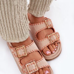 Damskie klapki z eko zamszu, które przyciągają wzrok ozdobnym obszyciem oraz efektownymi klamrami z przodu. Komfort noszenia zapewnia profilowana wkładka, która doskonale dopasowuje się do kształtu stopy. Ten modny model to świetny wybór na letnie dni idealny zarówno do miejskich stylizacji, jak i na wakacyjne wyjazdy!