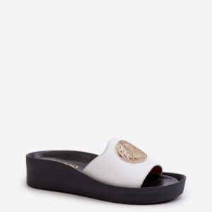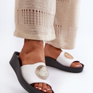 Eleganckie klapki wykonane z wysokiej jakości skóry naturalnej to idealny wybór dla kobiet ceniących styl i komfort. Osadzone na koturnie, zapewniają nie tylko dodatkową wysokość, ale również stabilność i wsparcie dla stóp przez cały dzień. Miękka wkładka dopasowuje się do kształtu stopy, zapewniając wyjątkowy komfort noszenia. Dodatkowym atutem jest złoty detal, który z pewnością przyciągnie wzrok. Te klapki doskonale sprawdzą się zarówno na co dzień, jak i na specjalne okazje, uzupełniając każdą stylizację od casualowej po bardziej formalną.