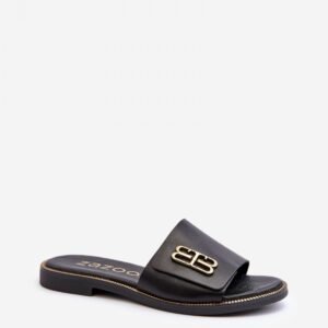 Eleganckie klapki damskie wykonane ze skóry naturalnej. Osadzone na płaskim obcasie. Z przodu złota ozdoba. Dzięki wysokiej jakości wykonania te klapki staną się nieodłącznym elementem letnich stylizacji!