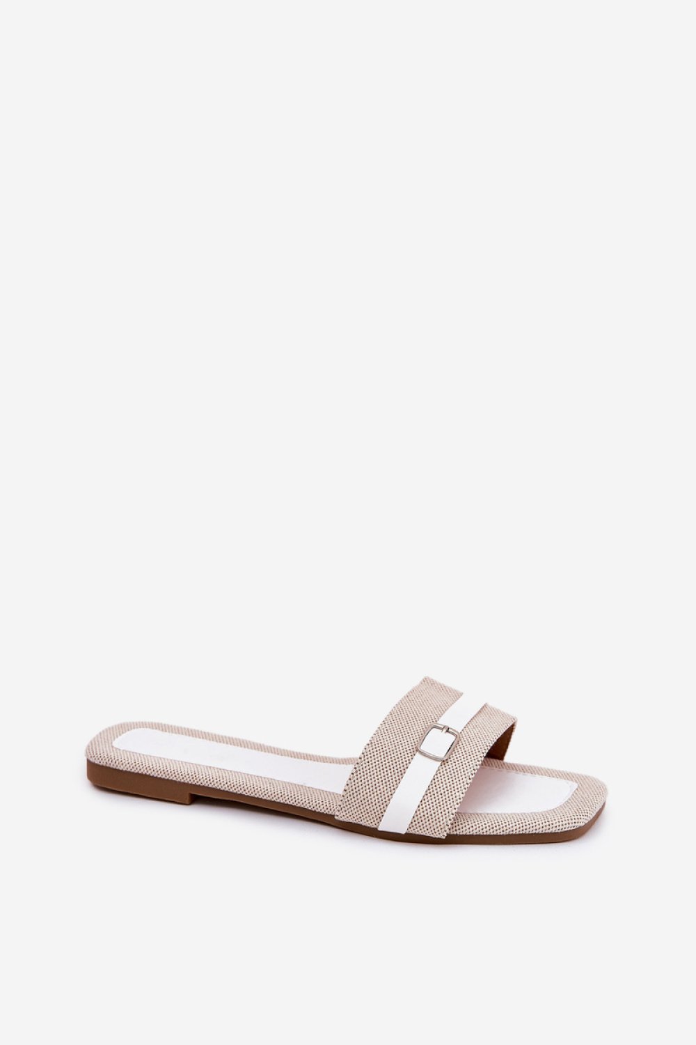 Płaskie klapki damskie z materiału tekstylnego, które łączą komfort z subtelnym stylem. Z przodu ozdobione cienkim paseczkiem ze sprzączką. Idealne na ciepłe dni, te klapki doskonale komponują się z letnimi zwiewnymi sukienkami i spodniami materiałowymi.