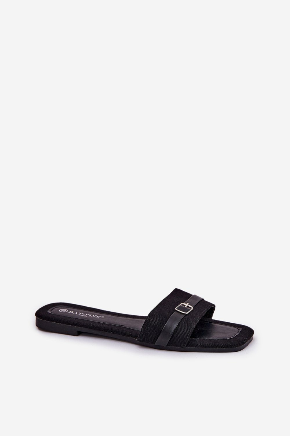 Płaskie klapki damskie z materiału tekstylnego, które łączą komfort z subtelnym stylem. Z przodu ozdobione cienkim paseczkiem ze sprzączką. Idealne na ciepłe dni, te klapki doskonale komponują się z letnimi zwiewnymi sukienkami i spodniami materiałowymi.