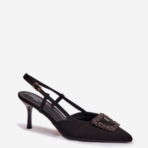 Eleganckie sandały damskie z eko zamszu to stylowa propozycja na wyjątkowe okazje. Smukły obcas typu szpilka oraz szpiczaste noski pięknie wysmuklają sylwetkę i nadają całości kobiecego charakteru. Ozdobny detal z przodu przyciąga wzrok i podkreśla elegancki wygląd modelu. Regulowany pasek zapinany na sprzączkę umożliwia idealne dopasowanie sandałów do stopy, zapewniając komfort noszenia. Te sandały doskonale sprawdzą się na przyjęcia, uroczystości i wieczorne wyjścia.
