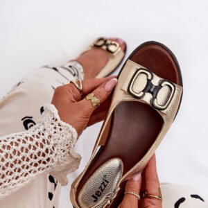 Sandały damskie marki Jezzi. Wykonane z wysokiej jakości eko skóry. Model ten wyróżnia się ozdobą umieszczoną z przodu, która dodaje im wyjątkowego uroku. Osadzone na płaskim obcasie. Miękka wkładka zapewni wygodę na każdym kroku. Zapinane na regulowany pasek ze sprzączką. Doskonałe na różne uroczystości i wieczorne wyjścia, te sandały świetnie komponują się zarówno z sukienkami, jak i spodniami, podkreślając kobiecy styl i elegancję.