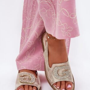 Sandały damskie wykonane z eko skóry stanowią stylową propozycję na upalne dni. Osadzone na płaskim obcasie, gwarantują komfort oraz stabilność przez cały dzień. Przód zdobi dekoracyjny element, dodający im delikatnego wdzięku. Wkładka z naturalnej skóry zapewnia wygodę przy każdym kroku. Dzięki zapinaniu na sprzączkę z regulowanym paskiem można je idealnie dopasować do stopy.
